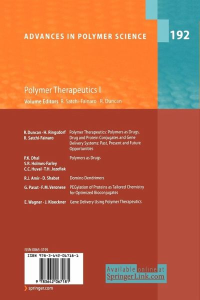 1 Duncan, H. Ringsdorf, R. Satchi-Fainaro: Polymer Therapeutics: Polymers as Drugs, Conjugates and Gene Delivery Systems: Past, Present and Future Opportunities.- 2 P.K. Dhal, S.R. Holmes-Farley, C.C. Huval, T.H. Jozefiak: Polymers as Drugs.- 3 R.J. Amir, D. Shabat: Domino Dendrimers.- 4 G. Pasut, F.M. Veronese: PEGylation of Proteins as Tailored Chemistry for Optimized Bioconjugates.- 5 E. Wagner, J. Kloeckner: Gene Delivery Using Polymer Therapeutics.-
