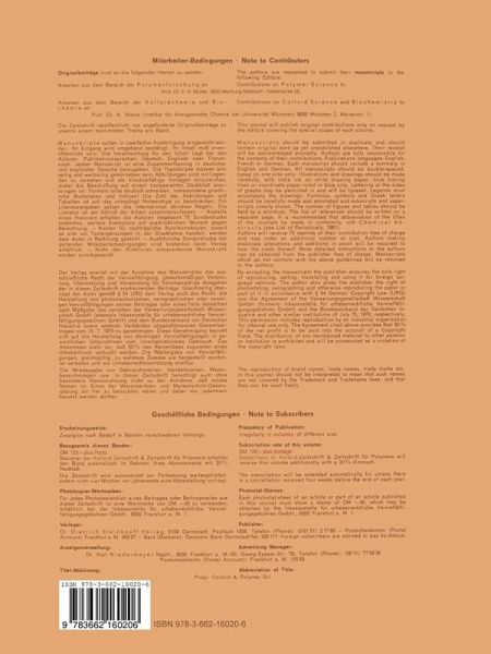 Zur Defekttheorie des ein-phasign Vorschmelzens von n-Paraffinen.- Smooth frequency distribution derived from complex phases.- Untersuchung der Dichteschwankungen in amorphen Polymeren durch Licht- und Röntgenkleinwinkelstreuung.- Lineare Parakristalle mit bimodaler Koordinationsstatistik.- Melting behaviour of low molecular weight poly (ethylene-oxide) fractions.- Thermodynamic characterization of metastable organic liquids at the quasi-static glass-transition-temperature.- Die Änderung der Dichte und der Schmelzwärme beim Tempern von 6.6-Polyamid.- Das Verhalten von Polypropylen bei der Einwirkung ionisierender Strahlen in Luft.- An analysis of thermally activated macro-deformation in polymers.- Rheologische Messungen an Polyisobutylenlösungen im Weissenberg-Rheogoniometer.- Deformation mechanisms in anisotropic polymers at small strains.- Comments on the morphology of polymers crystallized from oriented melts.- Emulsions eau-huile préparées à l'aide de copolymères sèquencés poly (styrène-b-oxyde d'éthylène).- Gleichgewichtsdrücke, Löslichkeit und Mischbarkeit des Systems. Unvernetztes Polystyrol (PS)/Kohlenwasserstoffe (KW).- Dye aggregations or crystals of acridine orange within natural fibres.- Interaction between acridine orange and sulphated polysaccharides.- Effect of syndiotactivity on the aqueous poly (vinyl alcohol) gel.- Sedimentationskonstante und scheinbares Molekulargewicht von Gelatine in Abhängigkeit von der Rotordrehzahl bei Ultrazentrifugenversuchen.- Über die Copolymerisation von Acrylnitril, Methacrylsäure und Vinylidenchlorid.- Simple determinations of the thickness and molecular orientations in some polymer monolayers by the Langmuir-Blodgett method.- Study of the bidimensional state conformation ofpoly-?-benzyl-L-aspartate.- Action of polyvinyl pyrrolidone on the interaction of polysilicic acid with human serum albumin monolayers.- A force field description for entanglements in polymer systems.- X-Ray scattering by wool and polyacrylonitrile graft copolymers.- Applications of polymer solution theory to monolayers.- Beschreibung der Transformation von Gläsern in Analogie zu den Telegraphengleichungen.