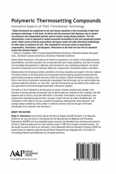 Engineering design teams sometimes have need of a material that may not exist because the combination of required properties is difficult to achieve. One solution is to develop a new material having the required set of properties needed in the application. During the author's 40-year career he has successfully worked on many such problems. The uniquely useful and valuable book, Polymeric Thermosetting Compounds: Innovative Aspects of Their Formulation Technology, presents twenty of those design problems and the solutions, which resulted in patents and spin-off applications. Author Ralph Hermansen, with years of experience of hands-on experience, is an expert in formulating epoxies, polyurethanes, and other polymers into compounds that have unique properties, and here he shares his knowledge and experience of attaining novel solutions to very challenging problems. He covers polymeric compounds such as coatings, adhesives, encapsulants, transparent plastics, and others. Chapters describe the design problem and define which key properties are sought in the new material. The author shares his thinking about how to approach the formulating problem and describes the experimental procedures used to eventually solve the problem. Patent information is shared as well. Once a new family of polymeric compounds is developed, that technology can be used to attack new unsolved materials problems, or "spin-offs," and real-life examples are provided to help readers see new applications of the technologies described in the earlier chapters. The book will be of interest to a diverse group of people. Industry professionals already in the business of selling specialty compounds may be able to add new products to their catalogs with little research cost or time by using the information in the book. Formulators, trying to develop a new compound to challenging requirements, may gain insight into how to make a breakthrough. The information in the book will be very valuable to companies needing these novel solutions. And younger people wondering what a career in materials science would be like get a first-hand commentary from someone who has done it.