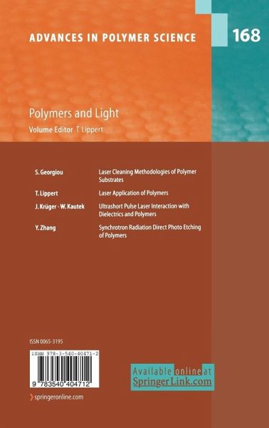 - S. Georgiou: Laser Cleaning Methodologies of Polymer Substrates - T. Lippert: Laser Application of Polymers - J. Krueger, W. Kautek: Ultrashort Pulse Laser Interactions with Polymers and Dielectrics - Y. Zhang: Synchrotron Radiation Direct Photo-Etching of Polymers.