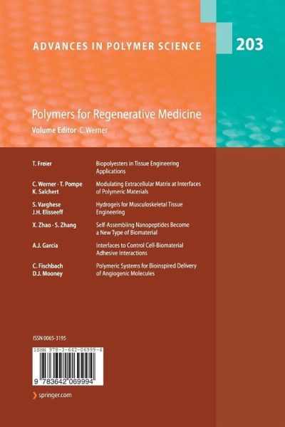 T. Freier: Biopolyesters in Tissue Engineering Applications.- C. Werner, T. Pompe, K. Salchert: Modulating Extracellular Matrix at Interfaces of Polymeric Materials.- S. Varghese, J.H. Elisseeff: Hydrogels for Musculoskeletal Tissue Engineering.- X. Zhao, S. Zhang: Self-Assembling Nanopeptides Become a New Type of Biomaterials.- A.J. Garcia: Interfaces to Control Cell-Biomaterial Adhesive Interactions.- C. Fischbach, D.J. Mooney: Polymeric Systems for Bioinspired Delivery of Angiogenic Molecules.