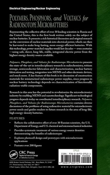 Representing the collective effort of over 30 leading scientists in Russia and the United States, this is the first book written solely on the subject of nuclear batteries. It presents a rich historical discussion and original research on the conversion of nuclear materials into electrical power, which can then be harvested to make long-lasting, more energy efficient batteries. With this technology, power-matched supplies would last decades - even centuries - using safe, direct, long-life, stable, integrated electric power from the highest energy density source available. Polymers, Phosphors, and Voltaics for Radioisotope Microbatteries presents the state-of-the-art in interdisciplinary research in radiochemistry, tritium storage, semiconductor fabrication and characterization, nuclear battery fabrication and testing, integration into MEMS and other electronic devices, and much more. A key feature of this book is its discussion of construction materials for miniaturized radioisotope power supplies, since progress in nuclear battery technology depends on characterization of functionally radiation-stable components. Though substantial progress has been made to solve problems of using integrated radioisotope batteries for micro- and nanoelectronics, each author has provided an authoritative assessment and has indicated where development is needed. Research in this area has the potential to revolutionize the microelectronics industry by enabling MEMS and nanotechnology. Significant technological progress depends today on coordinated interdisciplinary research. Polymers, Phosphors, and Voltaics for Radioisotope Microbatteries contains diverse discussions of the problems of using radioactive material for microelectronic power needs and guides readers to future research in the area of long-life, high energy-density batteries.