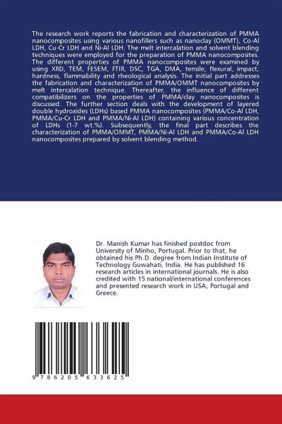 The research work reports the fabrication and characterization of PMMA nanocomposites using various nanofillers such as nanoclay (OMMT), Co-Al LDH, Cu-Cr LDH and Ni-Al LDH. The melt intercalation and solvent blending techniques were employed for the preparation of PMMA nanocomposites. The different properties of PMMA nanocomposites were examined by using XRD, TEM, FESEM, FTIR, DSC, TGA, DMA, tensile, flexural, impact, hardness, flammability and rheological analysis. The initial part addresses the fabrication and characterization of PMMA/OMMT nanocomposites by melt intercalation technique. Thereafter, the influence of different compatibilizers on the properties of PMMA/clay nanocomposites is discussed. The further section deals with the development of layered double hydroxides (LDHs) based PMMA nanocomposites (PMMA/Co-Al LDH, PMMA/Cu-Cr LDH and PMMA/Ni-Al LDH) containing various concentration of LDHs (1-7 wt.%). Subsequently, the final part describes the characterization of PMMA/OMMT, PMMA/Ni-Al LDH and PMMA/Co-Al LDH nanocomposites prepared by solvent blending method.