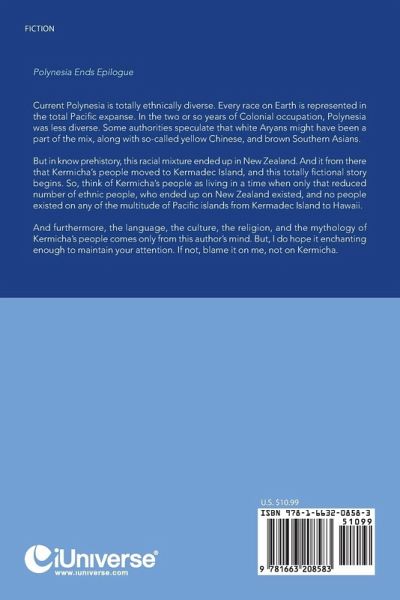 Polynesia Ends Epilogue Current Polynesia is totally ethnically diverse. Every race on Earth is represented in the total Pacific expanse. In the two or so years of Colonial occupation, Polynesia was less diverse. Some authorities speculate that white Aryans might have been a part of the mix, along with so-called yellow Chinese, and brown Southern Asians. But in know prehistory, this racial mixture ended up in New Zealand. And it from there that Kermicha's people moved to Kermadec Island, and this totally fictional story begins. So, think of Kermicha's people as living in a time when only that reduced number of ethnic people, who ended up on New Zealand existed, and no people existed on any of the multitude of Pacific islands from Kermadec Island to Hawaii. And furthermore, the language, the culture, the religion, and the mythology of Kermicha's people comes only from this author's mind. But, I do hope it enchanting enough to maintain your attention. If not, blame it on me, not on Kermicha.