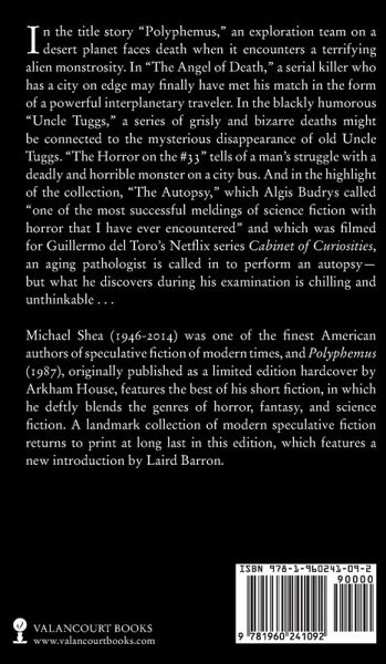 In the title story "Polyphemus," an exploration team on a desert planet faces death when it encounters a terrifying alien monstrosity. In "The Angel of Death," a serial killer who has a city on edge may finally have met his match in the form of a powerful interplanetary traveler. In the blackly humorous "Uncle Tuggs," a series of grisly and bizarre deaths may be connected to the mysterious disappearance of old Uncle Tuggs. "The Horror on the #33" tells of a man's struggle with a deadly and horrible monster on a city bus. And in the highlight of the collection, "The Autopsy," which Algis Budrys called "one of the most successful meldings of science fiction with horror that I have ever encountered" and which was filmed for Guillermo del Toro's Netflix series Cabinet of Curiosities, an aging pathologist is called in to perform an autopsy-but what he discovers during his examination is chilling and unthinkable ... Michael Shea (1946-2014) was one of the finest American authors of speculative fiction of modern times, and Polyphemus (1987), originally published as a limited edition hardcover by Arkham House, features the best of his short fiction, in which he deftly blends the genres of horror, fantasy, and science fiction. A landmark collection of modern speculative fiction returns to print at long last in this edition, which features a new introduction by Laird Barron.