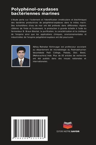 L'étude porte sur l'isolement et l'identification (moléculaire et biochimique) des bactéries productrices de polyphénol-oxydases dans le milieu marin. Des échantillons d'eau de mer ont été prélevés dans différentes régions côtières de l'Inde et l'isolement, la production à grande échelle à l'aide du fermenteur B. Braun Biostat, la purification, la caractérisation et la cinétique de l'enzyme ainsi que les applications cliniques, environnementales et industrielles de l'enzyme polyphénol-oxydase ont été poursuivis.