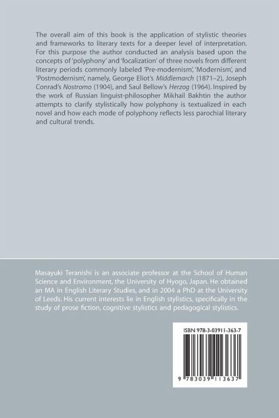 The overall aim of this book is the application of stylistic theories and frameworks to literary texts for a deeper level of interpretation. For this purpose the author conducted an analysis based upon the concepts of 'polyphony' and 'focalization' of three novels from different literary periods commonly labeled 'Pre-modernism', 'Modernism', and 'Postmodernism', namely, George Eliot's Middlemarch (1871-2), Joseph Conrad's Nostromo (1904), and Saul Bellow's Herzog (1964). Inspired by the work of Russian linguist-philosopher Mikhail Bakhtin the author attempts to clarify stylistically how polyphony is textualized in each novel and how each mode of polyphony reflects less parochial literary and cultural trends.