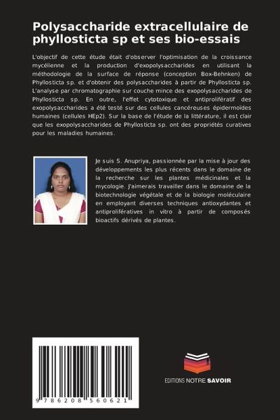 L'objectif de cette étude était d'observer l'optimisation de la croissance mycélienne et la production d'exopolysaccharides en utilisant la méthodologie de la surface de réponse (conception Box-Behnken) de Phyllosticta sp. et d'obtenir des polysaccharides à partir de Phyllosticta sp. L'analyse par chromatographie sur couche mince des exopolysaccharides de Phyllosticta sp. En outre, l'effet cytotoxique et antiprolifératif des exopolysaccharides a été testé sur des cellules cancéreuses épidermoïdes humaines (cellules HEp2). Sur la base de l'étude de la littérature, il est clair que les exopolysaccharides de Phyllosticta sp. ont des propriétés curatives pour les maladies humaines.
