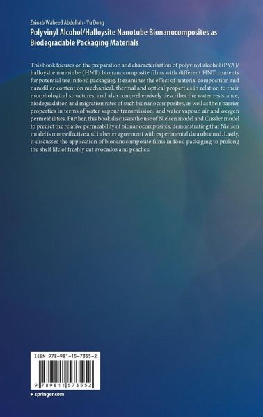 This book focuses on the preparation and characterisation of polyvinyl alcohol (PVA)/ halloysite nanotube (HNT) bionanocomposite films with different HNT contents for potential use in food packaging. It examines the effect of material composition and nanofiller content on mechanical, thermal and optical properties in relation to their morphological structures, and also comprehensively describes the water resistance, biodegradation and migration rates of such bionanocomposites, as well as their barrier properties in terms of water vapour transmission, and water vapour, air and oxygen permeabilities. Further, this book discusses the use of Nielsen model and Cussler model to predict the relative permeability of bionanocomposites, demonstrating that Nielsen model is more effective and in better agreement with experimental data obtained. Lastly, it discusses the application of bionanocomposite films in food packaging to prolong the shelf life of freshly cut avocados and peaches.