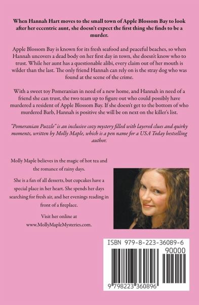 When Hannah Hart moves to the small town of Apple Blossom Bay to look after her eccentric aunt, she doesn't expect the first thing she finds to be a murder. Apple Blossom Bay is known for its fresh seafood and peaceful beaches, so when Hannah uncovers a dead body on her first day in town, she doesn't know who to trust. While her aunt has a questionable alibi, every claim out of her mouth is wilder than the last. The only friend Hannah can rely on is the stray dog who was found at the scene of the crime. With a sweet toy Pomeranian in need of a new home, and Hannah in need of a friend she can trust, the two team up to figure out who could possibly have murdered a resident of Apple Blossom Bay. If she doesn't get to the bottom of who murdered Barb, Hannah is positive she will be on next on the killer's list. "Pomeranian Puzzle" is an inclusive cozy mystery filled with layered clues and quirky moments, written by Molly Maple, which is a pen name for a USA Today bestselling author.