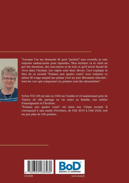 Lorsque l'on me demande de quoi "parlent" mes recueils, je suis toujours embarrassée pour répondre. Mon écriture va et vient au gré des émotions, des rencontres et de tout ce qu'il m'est donné de vivre dans l'instant. Les sujets sont donc divers. Ceci explique le titre de ce recueil "Poèmes aux quatre vents" avec toujours ce même fil rouge auquel ma plume s'est un jour librement attachée : tous les vers qui composent ces poèmes sont des alexandrins.