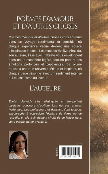Poèmes d'amour et d'autres choses vous entraîne dans un voyage sentimental et sensible, où chaque expérience vécue devient une source d¿inspiration intense. Les mots qüEvellyn Almeida, son auteure, tisse avec habileté vous enveloppent dans une atmosphère légère, tout en portant des émotions profondes et captivantes. Sa plume réussit à créer un univers poétique et inspirant, où chaque page résonne avec un sentiment intense qui touche l¿âme du lecteur.