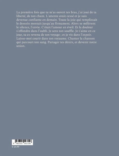 La première fois que tu m'as ouvert tes bras, j'ai joui de ta liberté, de ton chant. L'attente avait cessé et je suis devenue confiante en demain. Toute la joie qui remplissait le dessein montait jusqu'au firmament. Alors se mêlèrent le silence, l'envie. C'était l'amour en éveil. Et la douleur s'effondre dans l'oubli. Je sens ton souffle. Je t'aime en ce jour, tu es revenu de ton voyage ; et je vis dans l'espoir. Laisse-moi courir dans ton royaume. Chanter la chanson qui parcourt ton sang. Partager tes désirs, et devenir notre union.