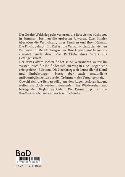 Der Zweite Weltkrieg geht verloren, die Rote Armee rückt vor, in Pommern brennen die eroberten Anwesen. Zwei Kinder überleben die Vernichtung ihrer Familien und ihrer Heimat. Die Flucht gelingt. Ihr Ziel ist die Verwandtschaft der kleinen Franziska im Mecklenburgischen. Ihre Jugend wird besser als erwartet. Auch durch die Rückkehr ihres Vaters aus Gefangenschaft.Der etwas ältere Jochen findet seine Verwandten weiter im Westen. Auch für ihn findet sich ein Weg in eine - sogar sehr erfolgreiche - Existenz. Die Nachkriegszeit kennt allerlei Elend und Entbehrungen, bietet aber auch erstaunliche Aufbaumöglichkeiten aus den Trümmern der Vergangenheit.Obwohl sich die Beiden völlig aus den Augen verloren haben, treffen sie doch wieder aufeinander. Ein Wiedersehen mit bewegenden Begleitumständen. Die Erinnerungen an die Kindheitserlebnisse sind noch sehr lebendig.