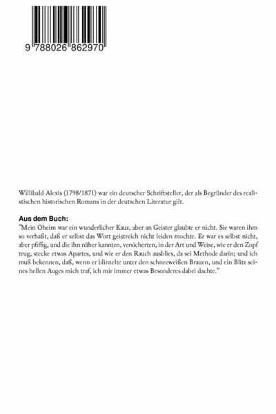 Willibald Alexis (1798/1871) war ein deutscher Schriftsteller, der als Begründer des realistischen historischen Romans in der deutschen Literatur gilt. Aus dem Buch: "Mein Oheim war ein wunderlicher Kauz, aber an Geister glaubte er nicht. Sie waren ihm so verhaßt, daß er selbst das Wort geistreich nicht leiden mochte. Er war es selbst nicht, aber pfiffig, und die ihn näher kannten, versicherten, in der Art und Weise, wie er den Zopf trug, stecke etwas Apartes, und wie er den Rauch ausblies, da sei Methode darin; und ich muß bekennen, daß, wenn er blinzelte unter den schneeweißen Brauen, und ein Blitz seines hellen Auges mich traf, ich mir immer etwas Besonderes dabei dachte."