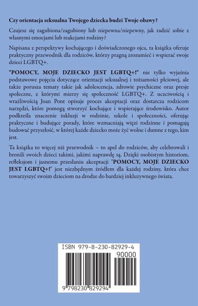 Czy orientacja seksualna Twojego dziecka budzi Twoje obawy? Czujesz si¿ zagubiona/zagubiony lub niepewna/niepewny, jak radzi¿ sobie z w¿asnymi emocjami lub reakcjami rodziny? Napisana z perspektywy kochaj¿cego i do¿wiadczonego ojca, ta ksi¿¿ka oferuje praktyczny przewodnik dla rodziców, którzy pragn¿ zrozumie¿ i wspierä swoje dzieci LGBTQ+. "POMOCY, MOJE DZIECKO JEST LGBTQ+!" nie tylko wyjänia podstawowe poj¿cia dotycz¿ce orientacji seksualnej i to¿samo¿ci p¿ciowej, ale tak¿e porusza tematy takie jak adolescencja, zdrowie psychiczne oraz presje spo¿eczne, z którymi mierzy si¿ spo¿eczno¿¿ LGBTQ+. Z uczciwo¿ci¿ i wräliwo¿ci¿ Joan Pont opisuje proces akceptacji oraz dostarcza rodzicom narz¿dzi, które pomog¿ stworzy¿ kochaj¿ce i wspieraj¿ce ¿rodowisko. Autor podkre¿la znaczenie inkluzji w rodzinie, szkole i spo¿eczno¿ci, oferuj¿c praktyczne i buduj¿ce porady, które wzmacniaj¿ wi¿zi rodzinne i pomagaj¿ budowä przysz¿o¿¿, w której käde dziecko mo¿e ¿y¿ wolne i dumne z tego, kim jest. Ta ksi¿¿ka to wi¿cej ni¿ przewodnik - to apel do rodziców, aby celebrowali i bronili swoich dzieci takimi, jakimi naprawd¿ s¿. Dzi¿ki osobistym historiom, refleksjom i jasnemu przes¿aniu akceptacji "POMOCY, MOJE DZIECKO JEST LGBTQ+!" jest niezb¿dnym ¿ród¿em dla kädej rodziny, która chce towarzyszy¿ swoim dzieciom na drodze do bardziej inkluzywnego ¿wiata.