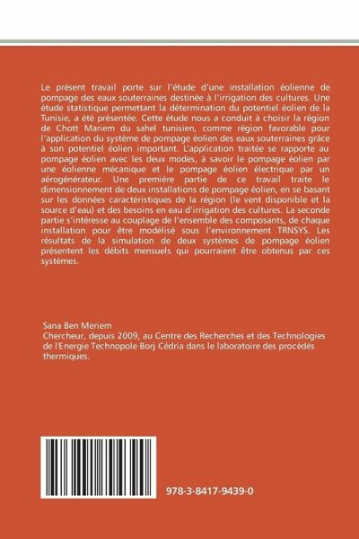 Le présent travail porte sur l étude d une installation éolienne de pompage des eaux souterraines destinée à l irrigation des cultures. Une étude statistique permettant la détermination du potentiel éolien de la Tunisie, a été présentée. Cette étude nous a conduit à choisir la région de Chott Mariem du sahel tunisien, comme région favorable pour l application du système de pompage éolien des eaux souterraines grâce à son potentiel éolien important. L application traitée se rapporte au pompage éolien avec les deux modes, à savoir le pompage éolien par une éolienne mécanique et le pompage éolien électrique par un aérogénérateur. Une première partie de ce travail traite le dimensionnement de deux installations de pompage éolien, en se basant sur les données caractéristiques de la région (le vent disponible et la source d eau) et des besoins en eau d irrigation des cultures. La seconde partie s intéresse au couplage de l ensemble des composants, de chaque installation pour être modélisé sous l environnement TRNSYS. Les résultats de la simulation de deux systèmes de pompage éolien présentent les débits mensuels qui pourraient être obtenus par ces systèmes.