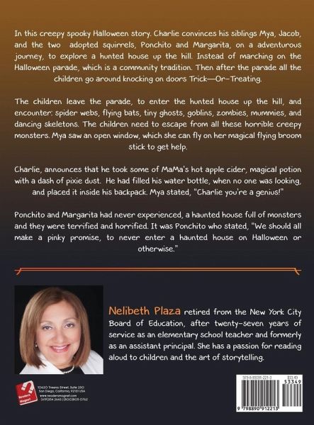 In this creepy spooky Halloween story. Charlie convinces his siblings Mya, Jacob, and the two adopted squirrels, Ponchito and Margarita, on a adventurous journey, to explore a hunted house up the hill. Instead of marching on the Halloween parade, which is a community tradition. Then after the parade all the children go around knocking on doors Trick-Or-Treating. The children leave the parade, to enter the hunted house up the hill, and encounter: spider webs, flying bats, tiny ghosts, goblins, zombies, mummies, and dancing skeletons. The children need to escape from all these horrible creepy monsters. Mya saw an open window, which she can fly on her magical flying broom stick to get help. Charlie, announces that he took some of MaMa's hot apple cider, magical potion with a dash of pixie dust. He had filled his water bottle, when no one was looking, and placed it inside his backpack. Mya stated, "Charlie you're a genius!" Ponchito and Margarita had never experienced, a haunted house full of monsters and they were terrified and horrified. It was Ponchito who stated, "We should all make a pinky promise, to never enter a haunted house on Halloween or otherwise."