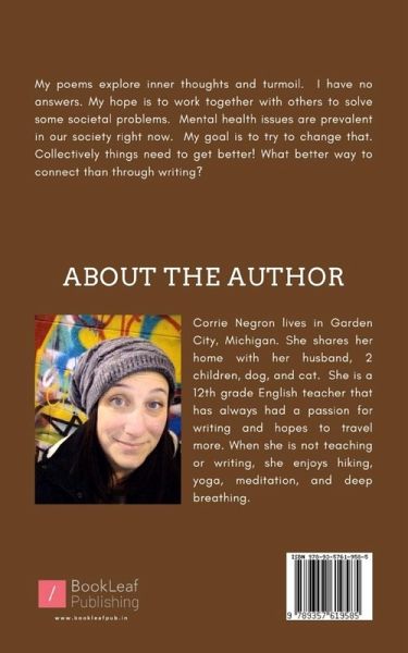 My poems explore inner thoughts and turmoil. I have no answers. My hope is to work together with others to solve some societal problems. Mental health issues are prevalent in our society right now. My goal is to try to change that. Collectively things need to get better! What better way to connect than through writing?