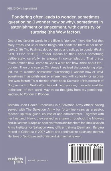 One of my favorite words in the Bible is "ponder." I love the fact that Mary "treasured up all these things and pondered them in her heart" (Luke 2:19). The Psalmist also pondered and calls us to ponder (Psalm 64:9, 111:2, 119:95). Ponder means to think about something deliberately, carefully, to engage in contemplation. That pretty much defines how I come to God's Word and how I think about life. I ponder. Then one year at Christmas I realized that pondering often led me to wonder, sometimes questioning (I wonder how or why), sometimes in astonishment or amazement, with curiosity, or surprise (the Wow factor). Thus, the title of this book. So much of life, so much of God, so much of God's Word has led me to ponder, to wonder in all the definitions of that word. May these thoughts from my ponderings lead you to Ponder in Wonder.
