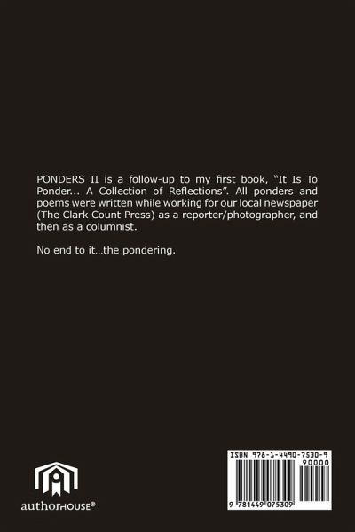 PONDERS II is a follow-up to my first book, "It Is To Ponder... A Collection of Reflections". All ponders and poems were written while working for our local newspaper (The Clark Count Press) as a reporter/photographer, and then as a columnist.