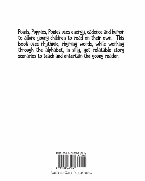Ponds, Puppies, Ponies uses energy, cadence and humor to allure young children to read on their own. This book uses rhythmic, rhyming words, while working through the alphabet, in silly, yet relatable story scenarios to teach and entertain the young reader.