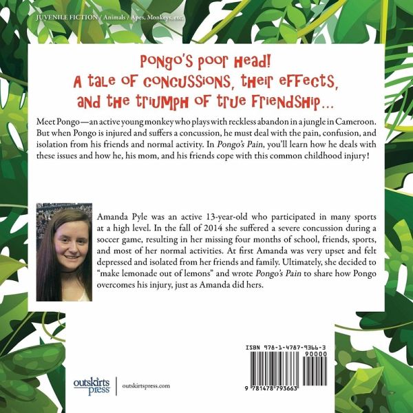 Pongo's poor head! A tale of concussions, their effects, and the triumph of true friendship... Meet Pongo-an active young monkey who plays with reckless abandon in a jungle in Cameroon. But when Pongo is injured and suffers a concussion, he must deal with the pain, confusion, and isolation from his friends and normal activity. In Pongo's Pain, you'll learn how he deals with these issues and how he, his mom, and his friends cope with this common childhood injury!