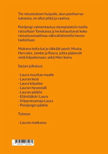 Tie ratsastuksen huipulle, alun poniharrastuksesta, on ollut pitkä ja vaativa. Ponijengi valmentautuu olympialaisiin isoilla ratsuillaan Tanskassa ja he kohauttavat koko ratsastusmaailmaa väkivallattomilla hevostaidoillaan. Mukana totta kai jo iäkkäät ponit: Musta, Hercules, Jambo ja Rosco, jotka pääsevät vielä kilpailemaan, sekä Meri koira. Sarjan julkaisut: - Laura muuttaa maalle - Lauran kesä - Laura kilpailee - Lauran hevostalli - Lauran päätös - Eläinlääkäri Laura - Kilparatsastaja Laura - Ponijengin päätös UUTUUS Lauran matkassa (sarjan viimeinen teos)