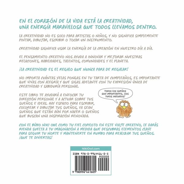 En el corazón de la vida está la creatividad, una energía maravillosa que todos llevamos dentro. La creatividad no es solo para artistas o niños, y no significa simplemente pintar, dibujar, escribir o tocar un instrumento. Creatividad significa usar la energía de la creación en nuestro día a día. El pensamiento creativo nos ayuda a innovar y mejorar nuestras relaciones, habilidades, talentos, comunidades y el planeta. ¡La creatividad es el regalo que nunca para de regalar! No importa cuántas velas pongas en tu tarta de cumpleaños, es importante que vivas con alegría y que sigas adelante con tu expresión única de creatividad y sabiduría personal. Este libro te ayudará a enfocar tu dirección personal y a actuar sobre tus sueños e ideas. Hay espacio para escribir, colorear y dibujar tus sueños, ya sean sueños que están aún por nacer o sueños que buscan una inspiración renovada. Con el búho Niki Owl como tu fiel copiloto en este viaje creativo, le darás rienda suelta a tu imaginación a medida que descubras elementos clave para seguir tu Norte y mantenerte en rumbo para realizar tus sueños. ¡Que te diviertas!