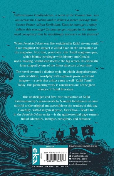 A SCINTILLATING NEW TRANSLATION OF THE CLASSIC TAMIL NOVEL. Vallavarayan Vandiyadevan, a scion of the Vaanar clan, sets out across the Chozha land to deliver a secret message from Crown Prince Aditya Karikalan. Does he manage to safely deliver this message? Or does he get trapped in the sinister royal conspiracy that he unwittingly uncovers on his journey? When Ponniyin Selvan was first serialised in Kalki, no one could have imagined the impact it would have on the circulation of the magazine. Nor that, years later, this Tamil magnum opus, which blends travelogue with history and Chozha myth-making, would lend itself to the big screen, its cinematic form shaped by one of the finest directors of our time. The novel invented a distinct style, in which slang alternates with erudition, wordplay with euphoric prose and vivid imagery-a style that critics came to call 'Kalki Tamil'. Today, this pioneering work is considered one of the great classics of Tamil literature. This unabridged and first-rate translation of Kalki Krishnamurthy's masterwork by Nandini Krishnan is at once faithful to the original and accessible to the readers of this day. Carefully crafted in lyrical prose, First Flood-Book One in the Ponniyin Selvan series-is the quintessential page-turner: full of adventure, intrigue, conspiracy and romance.