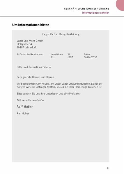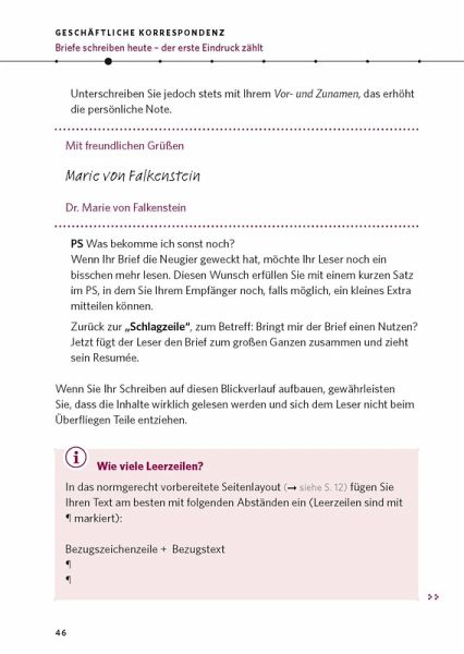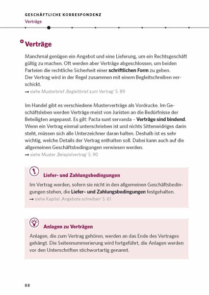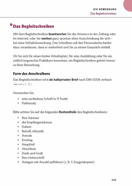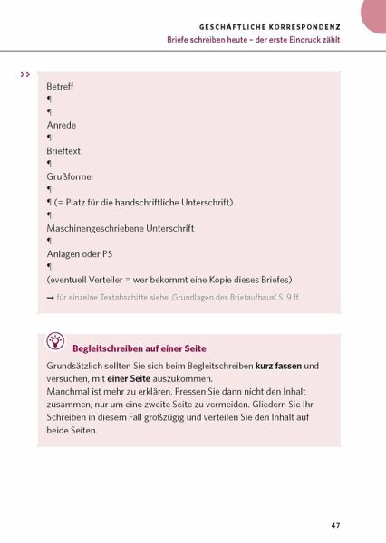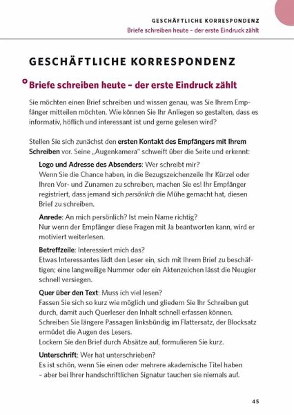 Professionell: Briefaufbau und -gestaltung nach DIN 5008 und DIN 676.Ausführlich: Musterbriefe für geschäftliche, halbprivate und private Anlässe.Wichtig: Bewerbung, Lebenslauf und Begleitschreiben.Flexibel: Zusätzliche Textbausteine zu allen Musterbriefen.Praxisnah: Zahlreiche Tipps, Hinweise und weiterführende Informationen.Nützlich: Deutsche Rechtschreibung und Zeichensetzung.Extra: Englische Korrespondenz.