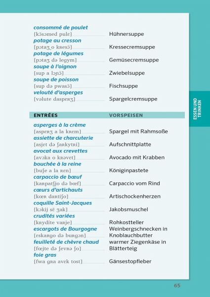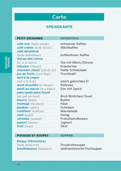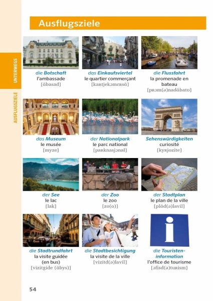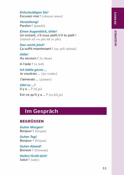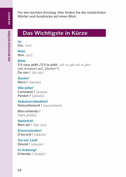 Praktische Ringbindung - ideal für unterwegs.Die wichtigsten Themen - von Arztbesuch bis Speisekarte.Lautschrift zu jedem Satz - für die richtige Aussprache.Mit Wörterbuch Französisch - Deutsch / Deutsch - Französisch - schnell das richtige Wort finden.Insider-Tipps - Land und Leute besser verstehen.Extra: Bilder zum Draufdeuten - so kommunizieren Sie ohne Worte.