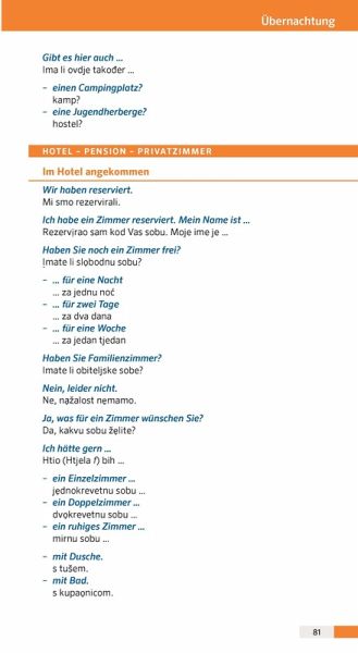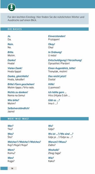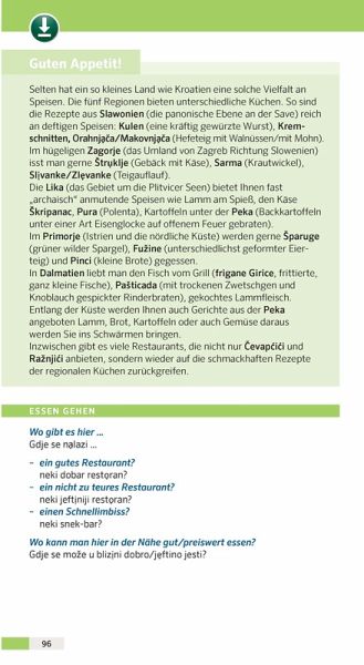 Niemals sprachlos: Finden Sie im Sprachführer den passenden Satz für jede Situation.Verstehen und verstanden werden: Mit dem Wörterbuch Kroatisch - Deutsch und Deutsch - Kroatisch kommen Sie überall sicher durch.Wie die Einheimischen: Mit Insider-Tipps verstehen Sie Land und Leute besser.Abseits der Touristenpfade: Die integrierte Speisekarte sorgt dafür, dass Sie in jedem Lokal zurecht kommen.Richtig aussprechen: Mit den wichtigsten Sätzen zum Anhören als Download.
