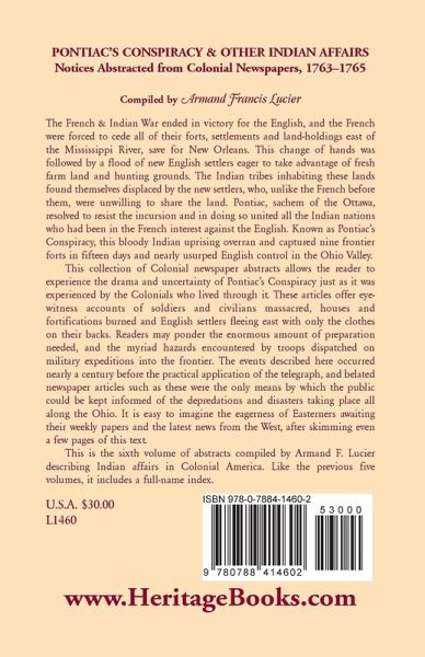 The French and Indian War ended in victory for the English, and the French were forced to cede all of their forts, settlements and land-holdings east of the Mississippi River, save for New Orleans. This change of hands was followed by a flood of new English settlers eager to take advantage of fresh farm land and hunting grounds. The Indian tribes inhabiting these lands found themselves displaced by the new settlers, who, unlike the French before them, were unwilling to share the land. Pontiac, sachem of the Ottawa, resolved to resist the incursion and in doing so united all the Indian nations who had been in the French interest against the English. Known as Pontiac's Conspiracy, this bloody Indian uprising overran and captured nine frontier forts in fifteen days and nearly usurped English control in the Ohio Valley. This collection of Colonial newspaper abstracts allows the reader to experience the drama and uncertainty of Pontiac's Conspiracy just as it was experienced by the Colonials who lived through it. These articles offer eye-witness accounts of soldiers and civilians massacred, houses and fortifications burned and English settlers fleeing east with only the clothes on their backs. Readers may ponder the enormous amount of preparation needed, and the myriad hazards encountered by troops dispatched on military expeditions into the frontier. The events described here occurred nearly a century before the practical application of the telegraph, and belated newspaper articles such as these were the only means by which the public could be kept informed of the depredations and disasters taking place all along the Ohio. It is easy to imagine the eagerness of Easterners awaiting their weekly papers and the latest news from the West, after skimming even a few pages of this text. This is the sixth volume of abstracts compiled by Armand F. Lucier describing Indian affairs in Colonial America. Like the previous five volumes, it includes a full-name index.