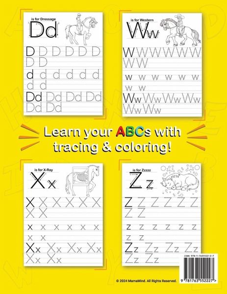 Introduce your child to the enchanting world of letters and writing with the "Pony ABC Writing Book," a delightful and educational tool designed for children aged 4 to 8. This interactive book combines the allure of ponies with the excitement of learning, making it the perfect resource for young learners to master their ABCs while developing essential writing skills. The "Pony ABC Writing Book" takes children on a magical journey through the alphabet, with each page dedicated to a specific letter. Children will enjoy tracing both uppercase and lowercase letters, with clear, simple guidelines to help them write accurately and confidently. The large, easy-to-trace letters are perfect for little hands, ensuring that young learners can practice their writing with ease. But the learning doesn't stop with tracing letters! Each page also features a beautifully illustrated pony-themed word that starts with the corresponding letter, providing a fun and engaging way to expand vocabulary. Words like "B is for Bridle," "D is for Dressage," "E is for Eventing," and "W is for Western" introduce children to the fascinating world of ponies and equestrian activities. These delightful illustrations are designed for children to color in, adding an extra layer of enjoyment to their learning experience. The "Pony ABC Writing Book" is crafted with high-quality paper to ensure that markers, crayons, and colored pencils can be used without bleeding through the pages, allowing for a clean and enjoyable coloring experience. The combination of tracing and coloring activities not only reinforces letter recognition and writing skills but also helps develop fine motor skills and hand-eye coordination. This book is more than just a writing tool; it's an introduction to the joys of reading, writing, and the enchanting world of ponies. Whether your child is a budding equestrian or simply loves animals, this book is sure to captivate their interest and make learning an adventure. Ideal for home use, classroom settings, or as a thoughtful gift, the "Pony ABC Writing Book" is an invaluable resource for parents and educators seeking to make the learning process engaging and enjoyable. Keywords: ABC tracing book, alphabet writing practice, pony-themed learning, children's coloring book, letter tracing for kids, handwriting practice, early literacy, educational activity book, fine motor skills development, preschool learning, kindergarten writing practice, pony coloring pages, kids handwriting book, pony ABC book. Help your child develop a strong foundation in writing and foster a love for learning with the "Pony ABC Writing Book."