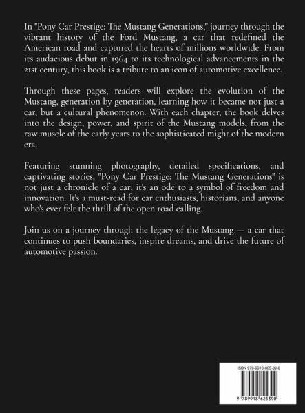 In "Pony Car Prestige: The Mustang Generations," journey through the vibrant history of the Ford Mustang, a car that redefined the American road and captured the hearts of millions worldwide. From its audacious debut in 1964 to its technological advancements in the 21st century, this book is a tribute to an icon of automotive excellence. Through these pages, readers will explore the evolution of the Mustang, generation by generation, learning how it became not just a car, but a cultural phenomenon. With each chapter, the book delves into the design, power, and spirit of the Mustang models, from the raw muscle of the early years to the sophisticated might of the modern era. Featuring stunning photography, detailed specifications, and captivating stories, "Pony Car Prestige: The Mustang Generations" is not just a chronicle of a car; it's an ode to a symbol of freedom and innovation. It's a must-read for car enthusiasts, historians, and anyone who's ever felt the thrill of the open road calling. Join us on a journey through the legacy of the Mustang - a car that continues to push boundaries, inspire dreams, and drive the future of automotive passion.