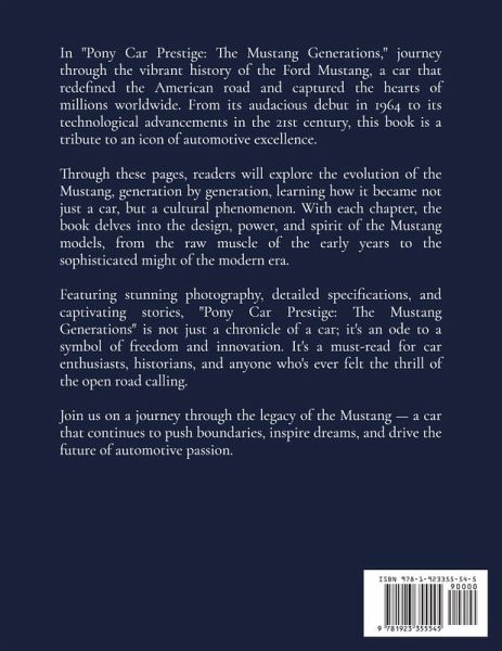 In "Pony Car Prestige: The Mustang Generations," journey through the vibrant history of the Ford Mustang, a car that redefined the American road and captured the hearts of millions worldwide. From its audacious debut in 1964 to its technological advancements in the 21st century, this book is a tribute to an icon of automotive excellence. Through these pages, readers will explore the evolution of the Mustang, generation by generation, learning how it became not just a car, but a cultural phenomenon. With each chapter, the book delves into the design, power, and spirit of the Mustang models, from the raw muscle of the early years to the sophisticated might of the modern era. Featuring stunning photography, detailed specifications, and captivating stories, "Pony Car Prestige: The Mustang Generations" is not just a chronicle of a car; it's an ode to a symbol of freedom and innovation. It's a must-read for car enthusiasts, historians, and anyone who's ever felt the thrill of the open road calling. Join us on a journey through the legacy of the Mustang - a car that continues to push boundaries, inspire dreams, and drive the future of automotive passion.
