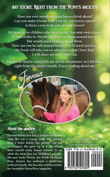 MY STORY, RIGHT FROM THE PONY'S MOUTH! Have you ever wondered what horses think about? Can you make a friend with a horse? Are horses smart? Is there a way to be safe around horses? My book is for children who love horses. You may own a horse or would like to. Maybe you have not been around horses but would enjoy reading about them. How can you be safe around horses? I will teach you how. My book will take you on adventures that I have had. I will share my story with you. You are invited to come with me on my adventures, as I tell them, right from the pony's mouth. Enjoy reading about me. FAVOUR.
