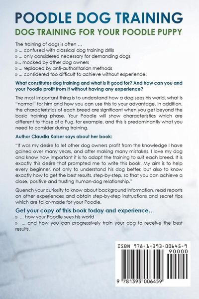 Poodle Training - Dog Training for your Poodle puppy The training of dogs is often...... confused with classical dog training drills ... only considered necessary for demanding dogs ... mocked by other dog owners ... replaced by anti-authoritarian methods ... considered too difficult to achieve without experience. What constitutes dog training and what is it good for? And how can you and your Poodle profit from it without having any experience? The most important thing is to understand how a dog sees his world, what is "normal" for him and how you can use this to your advantage. In addition, the characteristics of each breed are significant when you get beyond the basic training phase. Your Poodle will show characteristics which are different to those of a Husky, for example, and this is predominantly what you need to consider during training. This book is vol. 1 of the Poodle training books. Vol. 2 for your grown up Poodle is also available with the title "Poodle Training Vol. 2: Dog Training for your grown-up Poodle" Author Claudia Kaiser says about her book: "It was my desire to let other dog owners profit from the knowledge I have gained over many years, and after making many mistakes. I love my dog and know how important it is to adapt the training to suit each breed. It is exactly this desire that prompted me to write this book. My aim is to help every beginner, not only to understand his dog better, but also to know exactly how to get the best results, step-by-step, so that you can achieve a close, positive and trusting human-dog relationship." Quench your curiosity to know about background information, read reports on other experiences and obtain step-by-step instructions and secret tips which are tailor-made for your Poodle. Get your copy of this book today and experience...... how your Poodle sees his world ... and how you can progressively train your dog to receive the best results. Your Poodle will appreciate it... ... so this is my advice: Don't hesitate to buy this book! Content of this book: About the Author Preface What you need to know about your Poodle Cornerstones of training puppies Before the puppy arrives The first few weeks The first commands Training basic knowledge Check list for the start Conclusion