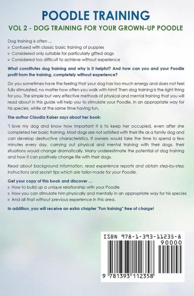 Poodle Training Vol 2 - Dog Training for your grown-up Poodle How to build up a unique relationship with your Poodle, using training methods which are tailor-made for your Poodle Dog training is often ... ... Confused with classic basic training of puppies ... Considered only suitable for particularly gifted dogs ... Considered too difficult to achieve without experience What constitutes dog training and why is it helpful? And how can you and your Poodle profit from the training, completely without experience? Do you sometimes have the feeling that your dog has too much energy and does not feel fully stimulated, no matter how often you walk with him? Then dog training is the right thing for you. The simple but very effective methods of physical and mental training that you will read about in this guide will help you to stimulate your Poodle, in an appropriate way for his species, while at the same time having fun. This is volume two of the Poodle training guides. Volume 1 for your Poodle puppy is also available with the title "Poodle Training: Dog Training for your Poodle puppy". The author Claudia Kaiser says about her book: "I love my dog and know how important it is to keep her occupied, even after she completed her basic training. Most dogs are not satisfied with their life as a family dog and can develop destructive characteristics. If owners would take the time to spend a few minutes every day, carrying out physical and mental training with their dogs, their situations would change dramatically. Many underestimate the potential of dog training and how it can positively change life with their dogs." Read about background information, read experience reports and obtain step-by-step instructions and secret tips which are tailor-made for your Poodle. Get your copy of this book and discover... ... How to build up a unique relationship with your Poodle ... How you can stimulate him physically and mentally in an appropriate way for his species ... And all that without previous experience in this area. In addition, you will receive an extra chapter "Fun training" free of charge!