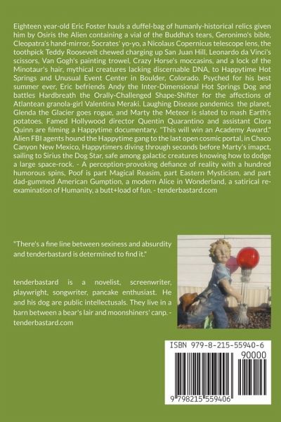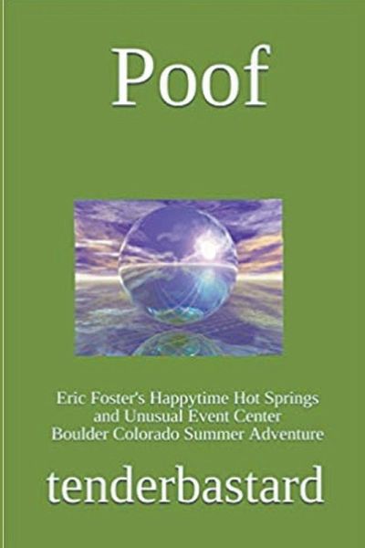With a translucent orb given him by Osirs the Alien containing a vial of the Buddha's tears, Geronimo's bible, Cleopatra's hand-mirror, Socrates' yo-yo, a Nicolaus Copernicus telescope lens, the Teddy Roosevelt toothpick he chewed charging up San Juan Hill, Leonardo da Vinci's scissors, Van Gogh's painting trowel, Crazy Horse's moccasins, and a lock of the Minotaur's hair, eighteen year-old Eric Foster hauls his relics to Happytime Hot Springs and Unusual Event Center in Boulder, Colorado. Psyched for his best summer ever, he befriends Andy the Inter-Dimensional Hot Springs Dog and competes for Atlantean granola-girl Valentina Meraki's affections with nemesis Hardbreath. Osris pops in looking like Jesus and The Big Lebowski, Colonel Chemtrail and his Space Force Hot Spots arrive with Socrates, the Buddha, Copernicus, da Vinci, Van Gogh, and Teddy Roosevelt and Happytime happy times rocket over the moon. Laughing Disease pandemics the planet, Glenda the Glacier goes rogue, and Marty the Meteor is slated to mash Earth's potatoes. Famed Hollywood director Quentin Quarantino and assistant Clora Quinn are filming a Happytime documentary. "This will win an Academy Award." Alien FBI agents hound the Happpytime gang all the way to the last open cosmic portal, in Chaco Canyon New Mexico, Happytimers diving through seconds before Marty's impact, rodeo-riding the Milky Way to Sirius the Dog Star, safe among galactic creatures knowing how to dodge a large space-rock. - A perception-provoking defiance of reality with a hundred humorous spins, Poof is Magical Realism, Eastern Mysticism, and dad-gummed American Gumption. A modern Alice in Wonderland, a satirical re-examination of Humanity, a butt-load of fun. - tenderbastard.com