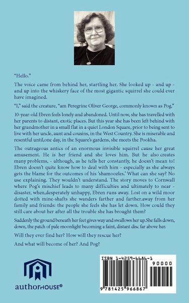"Hello." The voice came from behind her, startling her. She looked up - and up - and up into the whiskery face of the most gigantic squirrel she could ever have imagined. "I," said the creature, "am Peregrine Oliver George, commonly known as Pog." 10-year-old Ebren feels lonely and abandoned. Her parents are geologists, and, until now, she has travelled with them to far and exotic places. But this year she has been left behind and is staying with her grandmother in a small flat in a quiet London Square, prior to being sent to live with her uncle and aunt, and cousins Tristan and Tamzyn, in the West Country. She is miserable and resentful until,one day, in the Square's gardens, she meets the Pookha The outrageous antics of a two-metres-and-a-bit invisible squirrel cause her great amusement. He is her friend and she loves him. But he also creates many problems, .- although, as he tells her constantly, he doesn't mean to! Ebren doesn't quite know how to deal with him - especially as she always gets the blame for the outcomes of his 'shamoozles.' What can she tell people? Will they believe her? No use explaining. They wouldn't understand. They never did. With Ebren and Pog the story moves to Cornwall where Pog's mischief leads to all sorts of difficulties and ultimately to near - disaster, when, one dark, misty night, desperately unhappy, Ebren runs away. Lost, alone and terrified on a wild moor dotted with mine-shafts she wanders farther and farther.away from her family and friends, the people she loves but feels she has let down. How could they possibly still care about her, want her with them, after all the trouble she has brought them? Suddenly the ground beneath her feet gives way and swallows her up.She falls down, down, down, the patch of pale moonlight becoming a faint, distant disc far above her. Will they ever find her? How will they rescue her? And what will become of her? And Pog?