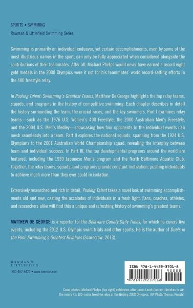 Pooling Talent highlights relay teams, squads, and programs spanning nearly a century of competitive swimming. From the 1976 U.S. Women’s 400 Freestyle relay to the 2001 Australian squad, and even including the North Baltimore Aquatic Club that has trained some of swimming’s top athletes, Matthew De George details these amazing assemblages of talent. De George delves into the intricate interplay between team and individual success, how four opponents can mesh quickly into a team and meet the challenges of performing as one. Certain accomplishments, even by some of the most illustrious names in the lexicon of swimming greats, can only be explained through the lens of the teams supporting them—Michael Phelps would never have earned a record eight gold medals in the 2008 Olympics were it not for his teammates’ world-record setting efforts in the 400 freestyle. Each chapter in Pooling Talent examines a separate relay team, national squad, or program, profiling the top swimmers, detailing their best moments, and examining what made that team so successful. Extensively researched, this book takes a novel look at swimming accomplishments old and new, casting the accolades of individuals in a fresh light.