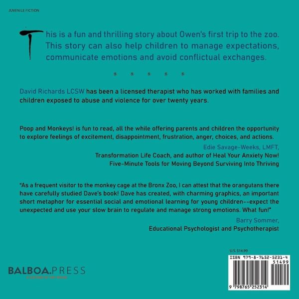 David Richards LCSW has been a licensed therapist who has worked with families and children exposed to abuse and violence for over twenty years. Poop and Monkeys! is fun to read, all the while offering parents and children the opportunity to explore feelings of excitement, disappointment, frustration, anger, choices, and actions. Edie Savage-Weeks, LMFT, Transformation Life Coach, and author of Heal Your Anxiety Now! Five-Minute Tools for Moving Beyond Surviving Into Thriving "As a frequent visitor to the monkey cage at the Bronx Zoo, I can attest that the orangutans there have carefully studied Dave's book! Dave has created, with charming graphics, an important short metaphor for essential social and emotional learning for young children--expect the unexpected and use your slow brain to regulate and manage strong emotions. What fun!" Barry Sommer, Educational Psychologist and Psychotherapist