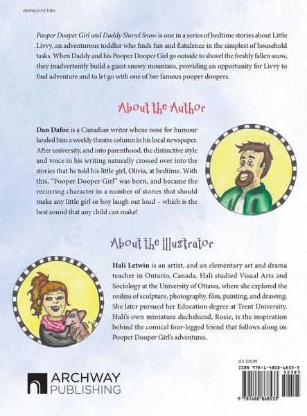 About the Author Dan Dafoe is a Canadian writer whose nose for humour landed him a weekly theatre column in his local newspaper. After university, and into parenthood, the distinctive style and voice in his writing naturally crossed over into the stories that he told his little girl, Olivia, at bedtime. With this, "Pooper Dooper Girl" was born, and became the recurring character in a number of stories that should make any little girl or boy laugh out loud - which is the best sound that any child can make! About the Illustrator Hali Letwin is an artist, and an elementary art and drama teacher in Ontario, Canada. Hali studied Visual Arts and Sociology at the University of Ottawa, where she explored the realms of sculpture, photography, film, painting, and drawing. She later pursued her Education degree at Trent University. Hali's own miniature dachshund, Rosie, is the inspiration behind the comical four-legged friend that follows along on Pooper Dooper Girl's adventures.