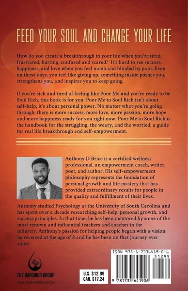 Take an inspirational journey of self-discovery to find an abundance of hope, peace, love, and happiness during some of the most difficult times of sadness, depression, doubt, and fear. When we are in the middle of our struggle, we are blinded by pain. We can't see how amazing tomorrow can be until we learn how to break through the pain we're in today. If fear and failure have kept you from creating the life you deserve, you will gain: A stronger sense of self A clearer vision for life A success mindset If you feel physically, emotionally, or spiritually weak or broken, you will attain: Renewed Faith Rejuvenated Spirit Healing insights If you yearn for that soulmate or you are losing hope in experiencing true love, you will discover: Unconditional Self-Love Unwavering Self-Confidence Affirmations of what you truly deserve Poor Me to Soul Rich is a personal growth guide of self-care and self-help that can ignite your soul, fuel your dreams, heal your heart, empower your spirit and change your life.