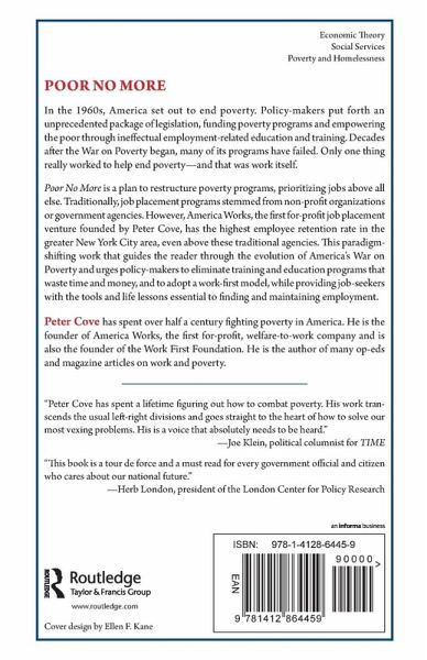In the 1960s, America set out to end poverty. Policy-makers put forth an unprecedented package of legislation, funding poverty programs and empowering the poor through ineffectual employment-related education and training. However, these handouts produced little change, and efforts to provide education and job-training proved inconsequential, boasting only a 2.8 percent decrease in the poverty rate since 1965. Decades after the War on Poverty began, many of its programs failed. Only one thing really worked to help end poverty-and that was work itself, the centerpiece of welfare reform in 1996. Poor No More is a plan to restructure poverty programs, prioritizing jobs above all else. Traditionally, job placement programs stemmed from non-profit organizations or government agencies. However, America Works, the first for-profit job placement venture founded by Peter Cove, has the highest employee retention rate in the greater New York City area, even above these traditional agencies. When the federal government embraced the work-first ideal, inspired by the success of America Works, welfare rolls plummeted from 12.6 million to 4.7 million nationally within one decade. Poor No More is a paradigm-shifting work that guides the reader through the evolution of America's War on Poverty and urges policy-makers to eliminate training and education programs that waste time and money and to adopt a work-first model, while providing job-seekers with the tools and life lessons essential to finding and maintaining employment.