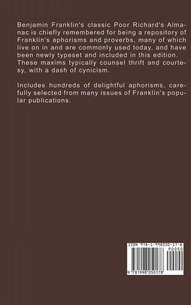 ���� Discover the Timeless Wisdom of Poor Richard's Almanac! ���� Are you ready to embark on a captivating journey through the corridors of history? Look no further than Benjamin Franklin's iconic masterpiece: Poor Richard's Almanac. This literary gem, lovingly curated and meticulously typeset, awaits your eager eyes. Why Should You Dive into Poor Richard's Almanac? 1. A Treasury of Aphorisms: Picture this-a sun-drenched morning, a steaming cup of coffee, and the delightful company of Franklin's aphorisms. These pithy, thought-provoking sayings have transcended time, weaving themselves into the very fabric of American English. From the bustling streets of colonial America to your cozy reading nook, these maxims counsel thrift, courtesy, and a dash of delightful cynicism. 2. A Portal to the Past: Imagine flipping through the pages of an almanac that once graced the hands of our founding fathers. Poor Richard's Almanac isn't just a book; it's a time machine. It whisks you away to an era when quills scratched parchment, and wisdom flowed like ink. As you read, you'll feel the pulse of history-the heartbeat of a nation striving for progress. 3. Practical Wisdom for Today: Franklin's almanac isn't a relic gathering dust. No, it's a living, breathing companion. Within its covers, you'll find advice that resonates across centuries. Whether you're pondering financial decisions, navigating relationships, or simply seeking a dose of wit, Poor Richard has your back. His aphorisms are like old friends-reliable, comforting, and eternally relevant. 4. A Symphony of Words: Franklin's wordplay dances across the pages. His sentences are like finely tuned instruments, playing melodies of industry, frugality, and human nature. Each aphorism is a gem, polished by time and wisdom. And guess what? You get hundreds of them! From the mundane to the profound, they'll leave you nodding in agreement or chuckling knowingly.