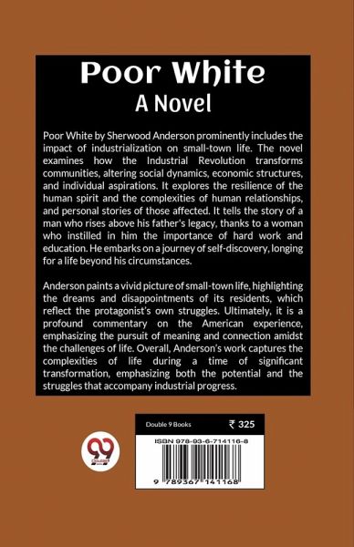 Poor White by Sherwood Anderson prominently includes the impact of industrialization on small-town life. The novel examines how the Industrial Revolution transforms communities, altering social dynamics, economic structures, and individual aspirations. It explores the resilience of the human spirit and the complexities of human relationships, and personal stories of those affected. It tells the story of a man who rises above his father's legacy, thanks to a woman who instilled in him the importance of hard work and education. He embarks on a journey of self-discovery, longing for a life beyond his circumstances. Anderson paints a vivid picture of small-town life, highlighting the dreams and disappointments of its residents, which reflect the protagonist's own struggles. Ultimately, it is a profound commentary on the American experience, emphasizing the pursuit of meaning and connection amidst the challenges of life. Overall, Anderson's work captures the complexities of life during a time of significant transformation, emphasizing both the potential and the struggles that accompany industrial progress.
