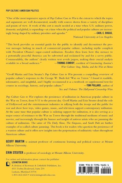 Pop Culture Goes to War, by Geoff Martin and Erin Steuter, explores the persistence of and opposition to militarism in American life. It provides a comprehensive overview of the role of toys, video games, music, television and movies in supporting contemporary militarism. Resistance to militarism is highlighted through the traditional mediums of music and movies, and increasingly through the arts, 'culture jamming,' and the satire of The Daily Show, The Onion, The Simpsons, The Colbert Report, and South Park.